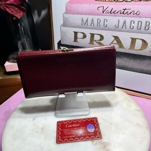 Must de Cartier Long Wallet kiss lock Leather Bordeaux Logo Gold Hardware EUC