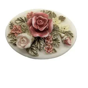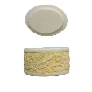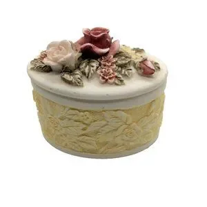 This beautiful floral ceramic box is very sweet. It is approximately 2 3/4" long, 1 5/8" wide and 1 /78" tall (to top of pink rose). In addition to the floral relief on the top, it has a floral pattern carved on the sides. This box has no damage.