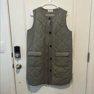 This Aritzia vest in a rich green hue features a quilted design for added warmth and style. Its long length and stand-up collar make it a versatile piece for layering during cooler days.