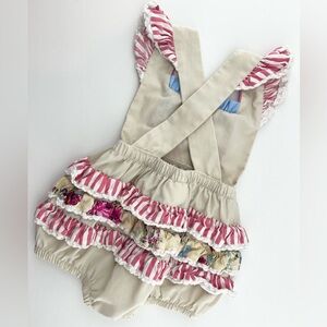 Adorable baby romper with floral and striped ruffles. Features pink, cream, and blue colors.