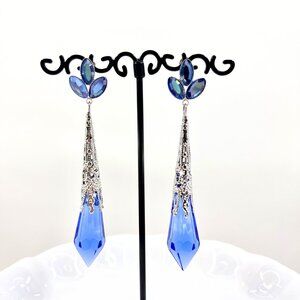 NWT – Charming Charlie – Blue Jeweled Drop Glass Dangle Silver Tone 3.5” Earring