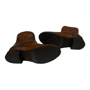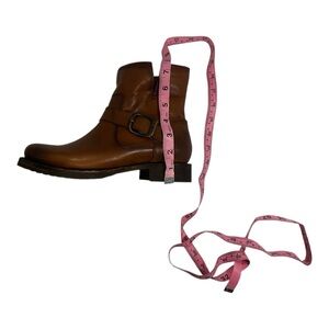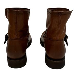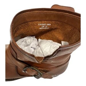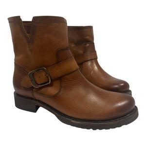 NWT Frye Veronica Ankle Bootie. Step into timeless style with Frye's brown ankle boots, crafted from rich leather for a natural finish. These boots feature decorative strap with a bronze buckle, offering both elegance and ease. The sturdy rubber sole and low block heel provide comfort and durability for everyday wear. Size 8.5.