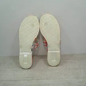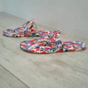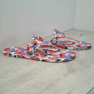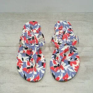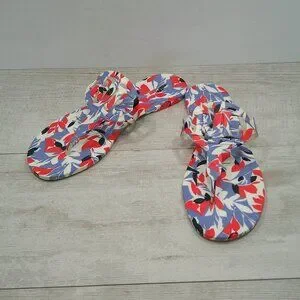 ACCENTS: 1/2" heel, Round-toe slip-on thong sandals, Logo cutout detailing at strap, Beautiful Botanical print. Colors Coral and blue with gray undertones.