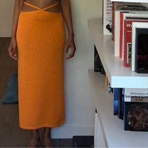 Tied along the waist with matching straps, Cult Gaia's Hedda midi skirt contours to the body in their sunny Marigold orange knit. Back tie closure.