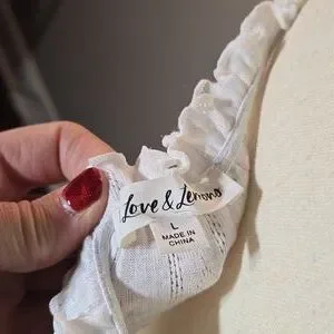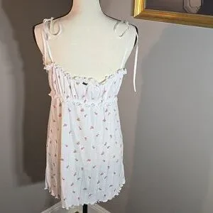 Charming white sleeveless dress with pink floral pattern. Features delicate shoulder ties and a ruffled neckline. Only tried on never worn out.
