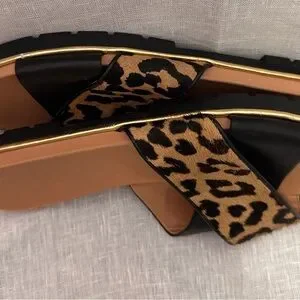 Step into fierce fashion with these Kate Spade New York leopard print slide sandals! The luxe calf hair strap features an eye-catching leopard pattern, complemented by sleek black leather accents and a subtle gold trim. Perfect for adding a pop of personality to any outfit!