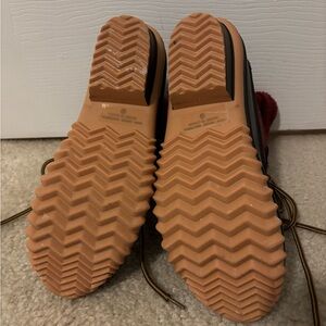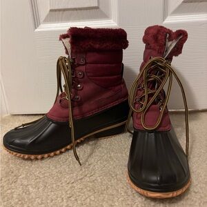 Womens duck boots with fluffy burgundy upper and solid waterproof sole. Excellent condition, I wore these boots once. Nature breeze size 8.5