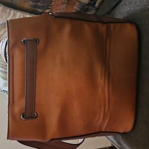Tan leather bag with shoulder strap. 2 side zippered pockets. Zip closure. Sbap front band to pull bag in tighter.
