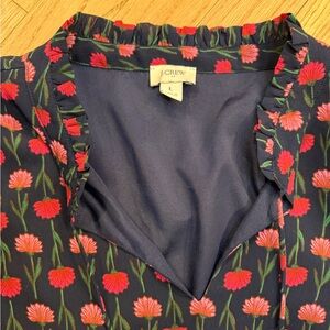 Chic blouse with ruffle sleeves, tie neckline and springy floral pattern!! Navy with red and pink flowers. Size large in excellent condition!! Like new. Neck can be worn tied or untied. Lightweight material perfect for multi-season layering.