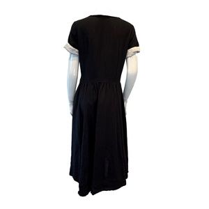 Classic Dress, Short Sleeve - Black Pansy White Collar . Dresses are made to order. Made of soft linen with Peter Pan collar. The full skirt falls in a flattering A-line shape, has a concealed side zip, two side seam pockets and thoughtful white inside finishing. A-line romantic skirt is an invite for a nostalgic dance. In excellent preloved condition.
