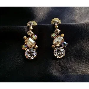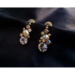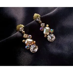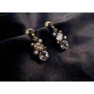 These vintage Sorrelli earrings feature a captivating design with dark amber and yellow rhinestones that shimmer brilliantly. The rhinestones are carefully set in a warm bronze-tone metal, showcasing an antique-inspired style. Each earring is beautifully crafted, with the rich, golden hues of the amber and yellow stones creating a warm and eye-catching look.
