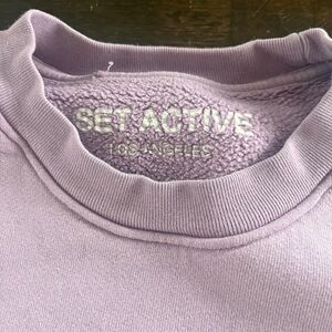 Set Active Two Piece Lounge Set Sweats Comfort Heavy Cotton Lavender Size M. Please see last photo. Small stain on sweatshirt. I have not worked to remove but could possibly be treated. Otherwise, lots of life left.