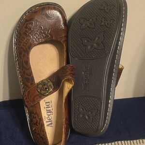 These Alegria dress shoes feature a rich brown leather with a glossy finish and an intricate floral embossed pattern. The classic Mary Jane style includes a rounded toe and a single adjustable strap for a secure fit. The dark gray sole provides excellent grip, making them both stylish and practical for any formal occasion.
