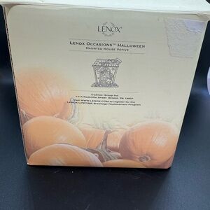 Lenox occasion haunted house votive candle display with intricate details and gold accents. Features a black cat and star cutouts. Perfect for adding a whimsical touch to any room. New in box. Only the styrofoam was slightly damaged when removed for pictures.