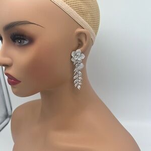 Only one pair in stock. 18k gold plated. Silver tone. Hypoallergenic. Not heavy. Clear cz stones. Earrings are 3”