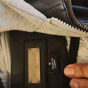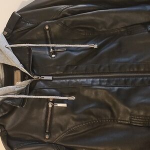 Stylish women's black faux leather jacket featuring a gray hoodie that can be unzipped and detached. (See Picture)