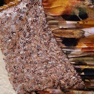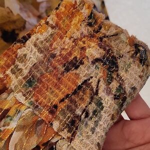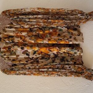 sheer sleeves have metallic gold thread detail with elastic cuffs. gold sequins at shoulders. back button closure. approx mmts underarm 21.5 in, length 24 in, sleeve 26 in.