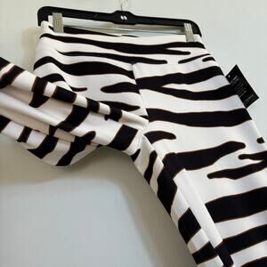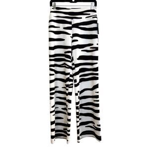 zebra print pattern, wide-leg cut, high-rise waist, pull-on style, Size XXS, lightweight fabric, flowy silhouette, white and black contrast, stretchy waistband, bold design