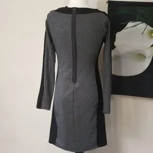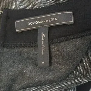 BCBGMaxazaria Sage dress. Silver sparkling dress with black trimming/striping along side and sleeve. Long sleeve. Half zip back closure. Like a boat neck, but not wide as the shoulders.