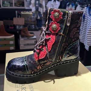 Leather combination boot with flower cutouts, studs, top strap, and rainbow stitching on the lug of the sole. Leather uppers, faux fur lining, lace up style with zipper side for easy on and off!