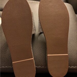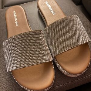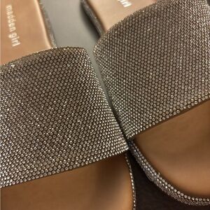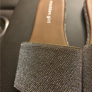 Rhinestone slides Stylish Madden Girl flats. Silver faux gem design. Comfortable slip-on style.