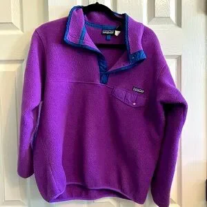 Vintage purple Patagonia fleece pullover with navy blue trim, size large, normal wear with minor pilling, from smoke free, dog friendly home