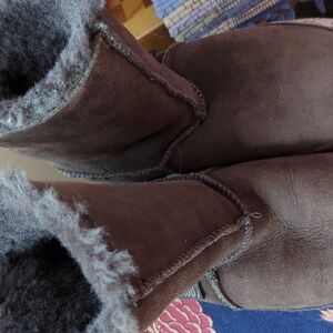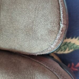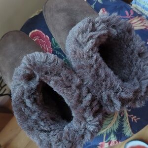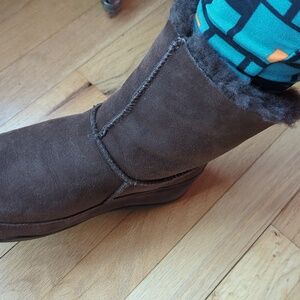 suede with shearling .. wobble board bottoms.. so comfy for long walks in the snow!