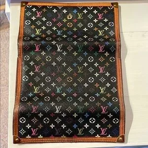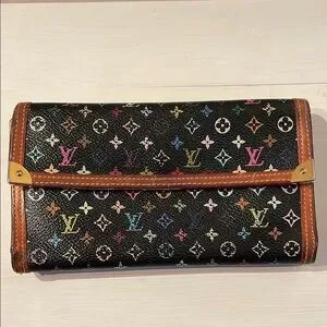 This elegant Louis Vuitton wallet showcases the iconic monogram pattern in a striking black color, accented with a rich brown leather trim. Its sleek, rectangular design is perfect for carrying your essentials in style, making it a luxurious addition to any collection. In great shape for her age.
