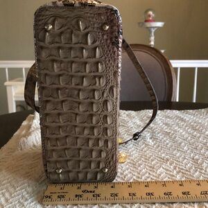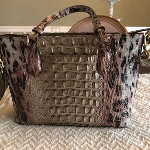 This elegant tote bag showcases a luxurious crocodile-like texture in a captivating blend of pink and brown hues. Its structured design and double handles offer both style and practicality, making it a perfect accessory for any occasion.