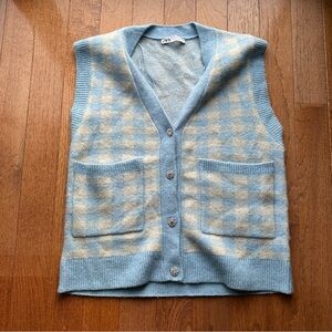 Zara light blue button sweater vest with embellished button detailing & v-neck design.