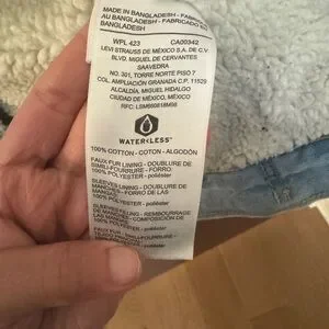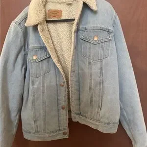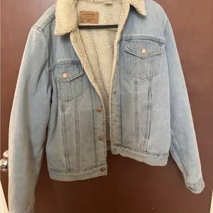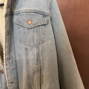 Classic light blue denim jacket. Features sherpa lining. Button-front closure. Two chest pockets.