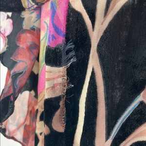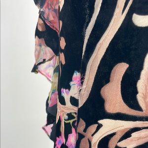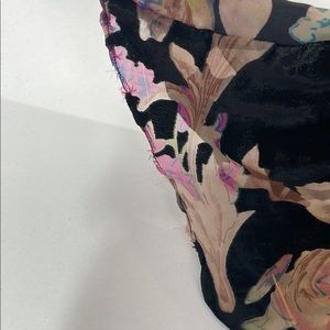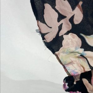 Horizontal tear along back seam under zipper. Under the front ruffle the fabric has separated at seam. Along the side seam are three places where outer layer has/is separating at seam and one along back center seam below the tear. Hem has fraying edge that needs to be trimmed.