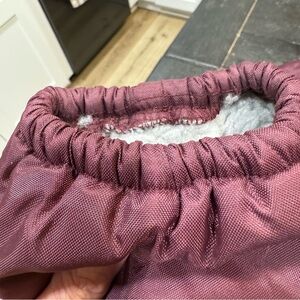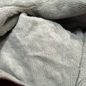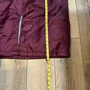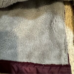 Oversized puffy parka, maroon, gray fleece lining, zipper front, hoodie, L.