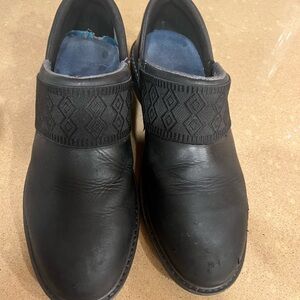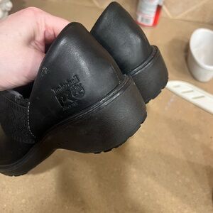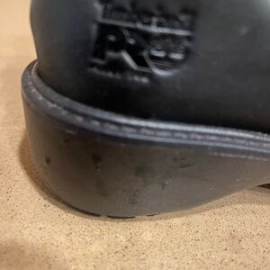 My daughter needed steel toe shoes for her work. She used them about a month paid over $200 for them Timberland size 7. They are leather so you could shine them up with black shoe polish if needed still in good condition.