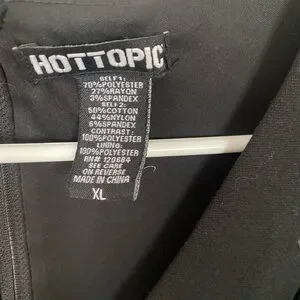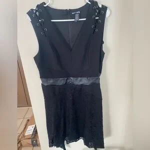 Hot Topic fit and flare dress. The V-neck bodice has lace-up shoulder straps and leads to a fitted faux leather waistband. The flared skirt has a black floral lace sharkbite hem overlay. Back zipper closure.