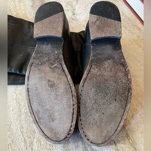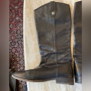 Melissa Button Black Leather Women's High Riding Biker Boots. Size 7.5 B, medium US. Leather uppers. Leather and rubber soles. From smoke-free home. Clean inside and out. Very well built and sturdy. Small scuff on one of the toes (pictured) otherwise normal wear.
