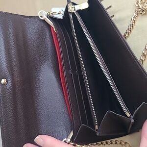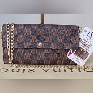 INDULGE IN THE VINTAGE SIDE OF LOUIS VUITTON LUXURY W THIS TIMELESS ICONIC VINTAGE 2010 DAMIER PORTE MONNAIE 10 CARD CREDIT WALLET W REMOVABLE UNBRANDED CHAIN & INSERT THAT CONVERTS WALLET TO SHOULDER/CROSS BODY USE. ALSO CAN ADD YOUR OWN CHAIN OR LEATHER STRAP EASILY FOUND ON AMAZON