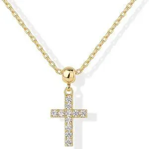 This 14K yellow gold-plated adjustable sliding chain is 18 inches long and 1.2mm wide and features a 12mm x 8.6mm cross pendant with 1.5mm cubic zirconia stones.