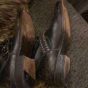 These are fry boots with more of a rounded toe not very pointy just rounded with studs. These boots have newer heels. You can’t even tell they . I purchased them on Poshmark and I haven’t even wore them yet. I’ve tried them on. They are comfortable. They would fit a size 10 as well. There’s plenty of tread. I don’t even think the person before me more than more than two or three times.
