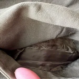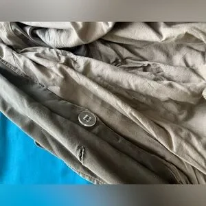 Notice left pocket is torn on the inside, not noticeable from the outside, and the small something on the left sleeve.