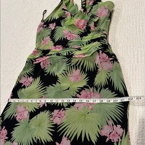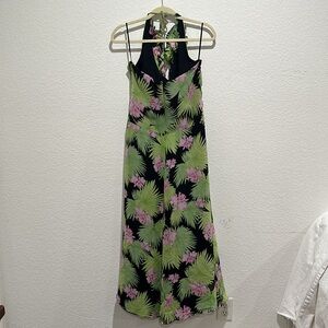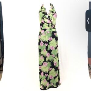 KAY UNGER Silk Tropical Floral Halter Ruffle Maxi Dress Black Green Pink…