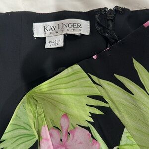 Gorgeous Kay Unger full-length silk chiffon halter dress with ruffled collar and 4" ruched waistband. Dress zips and ties in back and is completely lined. Showstopper! Kay Unger NY 100% silk chiffon maxi dress. Beautiful tropical colors: black, green and pink. Halter top with ruffle trim at neck and pleated band at waist. Flowy A-line skirt