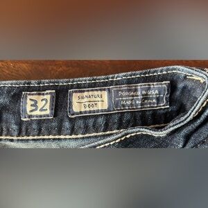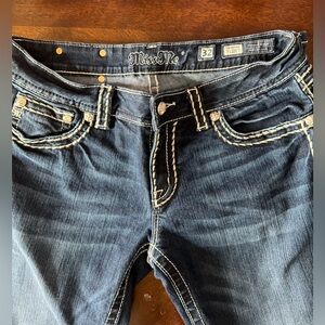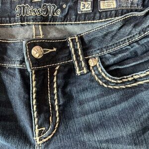 These are Miss Me boot cut jeans in size 32 with a 34-inch inseam. The jeans feature rhinestone embellishments, embroidered logos, and sequin accents. They have a low rise and are made of denim fabric with a medium wash. The color is blue, and the material is a cotton blend. The jeans have a zip and button closure, with a regular fit and stretch fabric for comfort. The style is perfect for a rock or cowboy themed look.