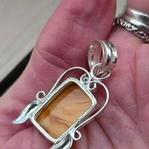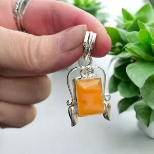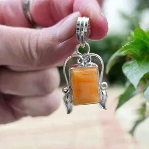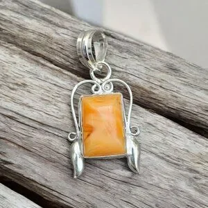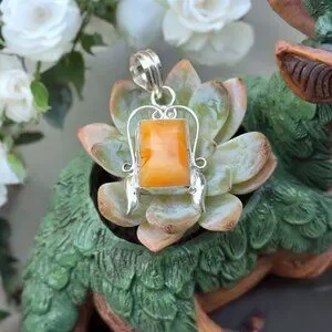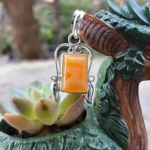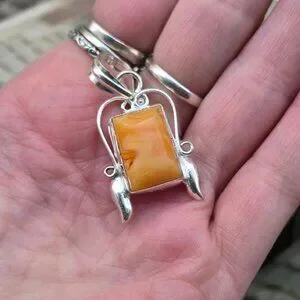 This amber pendant, cradled in a delicate sterling silver frame, speaks of ancient warmth and energy.
