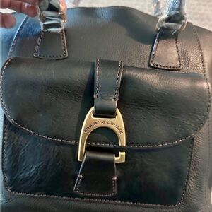 This sophisticated satchel from Dooney & Bourke features a sleek black and gold color palette, crafted from a textured leather Florentine material. Its trapezoid shape and unique handle design make it a standout accessory for any occasion. Comes to you from a smoke and pet free home. Thank you for stopping by.