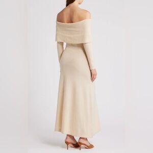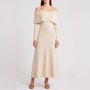 This off-the-shoulder knit dress combines modern sophistication with cozy comfort for a versatile, season-spanning look.