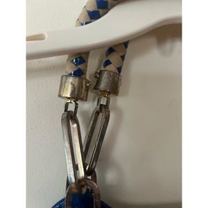Tory Burch Canvas Tote Purse Bag Beach Beige Navy Blue w/ Gold Logo