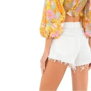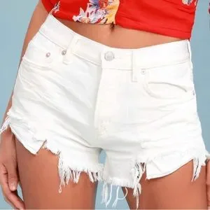 White distressed jean shorts for the best fun in the sun! Enjoy top-notch denim shorts in the Loving Good Vibrations Shorts. Featuring, classic denim cutoffs featuring an exaggerated raw hem and distressed detailing, feel all the good vibes and bask in good weather for the day.