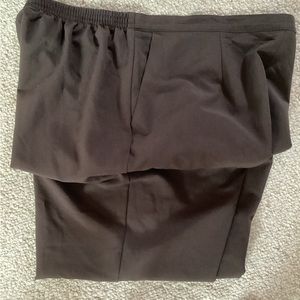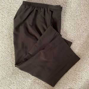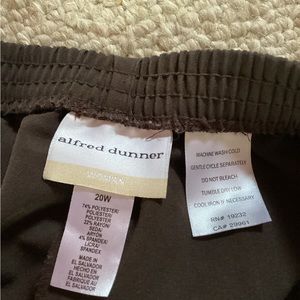 One pair of woman’s pants by Alfred DUNNER, brown. Used. 20W. Polyester/spandex blend. Flat front waistband with elastic back. Pull on pant with side pockets.