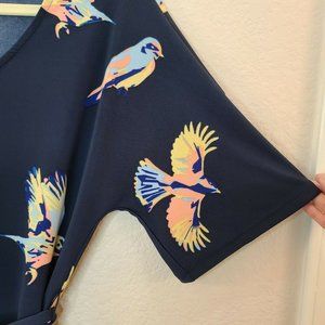 Deletta Top Women XS Petite Navy Bird Novelty Print Knit Dolman Sleeve Tie Waist